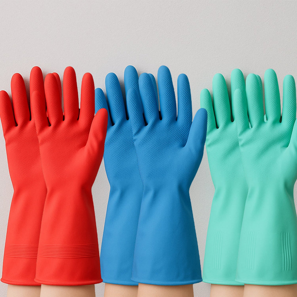 These premium multipurpose cleaning gloves are designed to provide complete hand protection during dishwashing, laundry, car washing, and household chores. Made from high-quality rubber material, they are soft yet durable, offering flexibility and comfort even after prolonged use. The long cuff design ensures water resistance and prevents splashes from entering, keeping hands dry and clean. The inner lining provides a comfortable grip and sweat-free experience, while the textured palm and fingertips enhance non-slip performance for improved handling of wet utensils or surfaces. Each pack includes one pair in assorted mix colors—red, blue, or green—adding a vibrant touch to your cleaning routine. Ideal for everyday home use, these gloves are reusable, washable, and built for long-lasting protection.